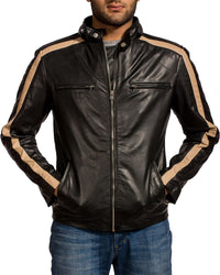 Elite Men's Creame Stripes Black Biker Leather Jacket - Black / XS