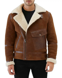 Mens Aviator Brown and White Shearling Leather Jacket Sale