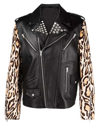 Elite Mens Leopard Print Biker Leather Jacket - XS / Black