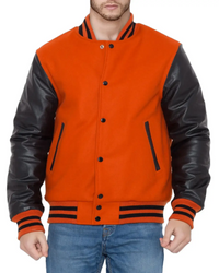 Get ready to embrace the vibrant side of fashion with the Men's Orange and Black Varsity Jacket. The striking orange color adds a burst of energy to the classic black varsity jacket design, creating a look that demands attention. This jacket is a perfect blend of boldness and sophistication. The front button closure and rib-knit cuffs bring a touch of retro coolness, while the comfortable fit ensures all-day comfort. With its well-placed pockets, this jacket offers both practicality and style. Step outside the fashion norms and let your vibrant personality shine with this standout orange and black masterpiece.