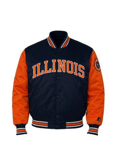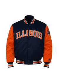 Experience ultimate comfort with a soft viscose lining and practical design, including two outside and two inner pockets. Adorned with distinctive fabric applique stitched Illinois lettering, an imprinted team emblem, and Starter branded embroidery, this vintage Starter jacket boasts fine quality stitching. Grab your classic Illini apparel today and celebrate the Fighting Illini in unmatched style.