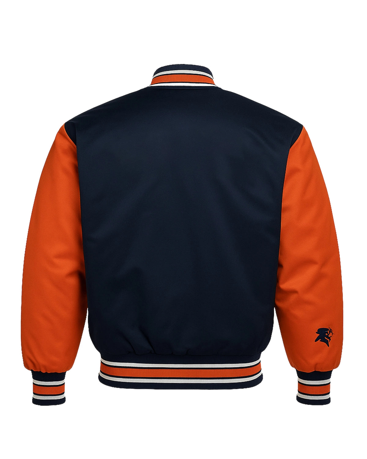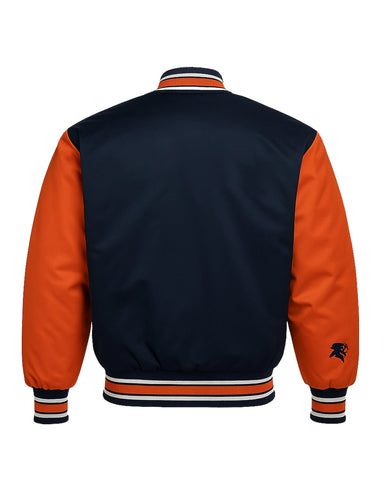 Step back in time and showcase your team spirit with the iconic 90’s Illinois Fighting Illini jacket. Crafted from luxurious satin bomber jacket material in a striking black and orange combo, this piece features a classic rib-trim striped collar, cuffs, and hemline. The full snap closure enhances its authentic Illinois black and orange varsity jacket appeal, making it perfect for any fan.