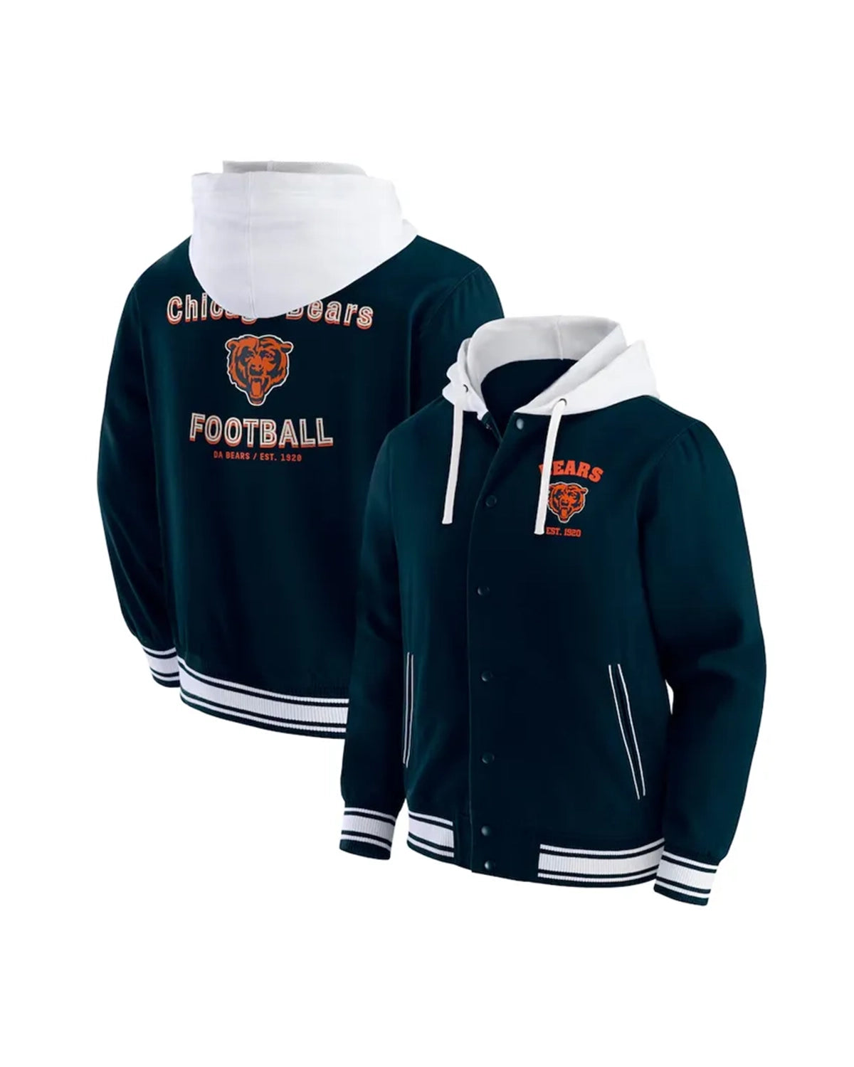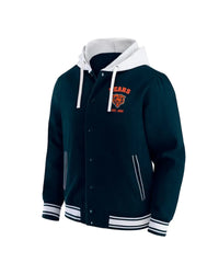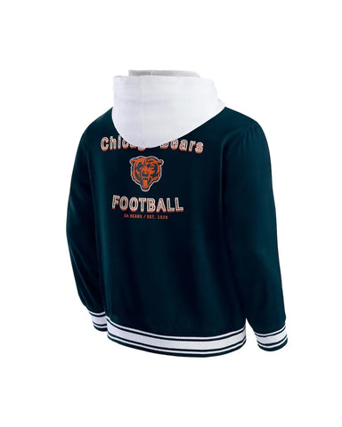 Embrace authentic team spirit with the Elite Chicago Bears Navy Cotton Hooded Jacket. Crafted from high-quality navy cotton, this stylish jacket features a contrast hooded collar with adjustable drawstrings, perfect for showcasing your unwavering loyalty. Its full snap tab button closure and rib-woven striped cuffs offer a timeless, classic look, making it essential Bears fan apparel for any dedicated supporter.