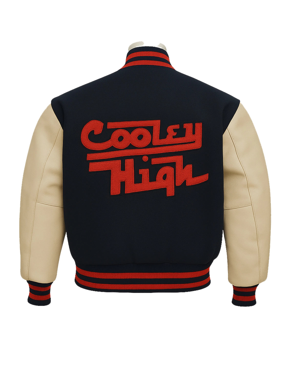 Step into timeless style with our exclusive Cooley High Varsity Jacket, a tribute to the iconic film. This exquisite piece boasts a premium wool body expertly paired with sleek genuine leather sleeves, offering both superior warmth and enduring sophistication. Designed in a striking stylish off-white and black color scheme, it captures that authentic, classic look everyone desires.