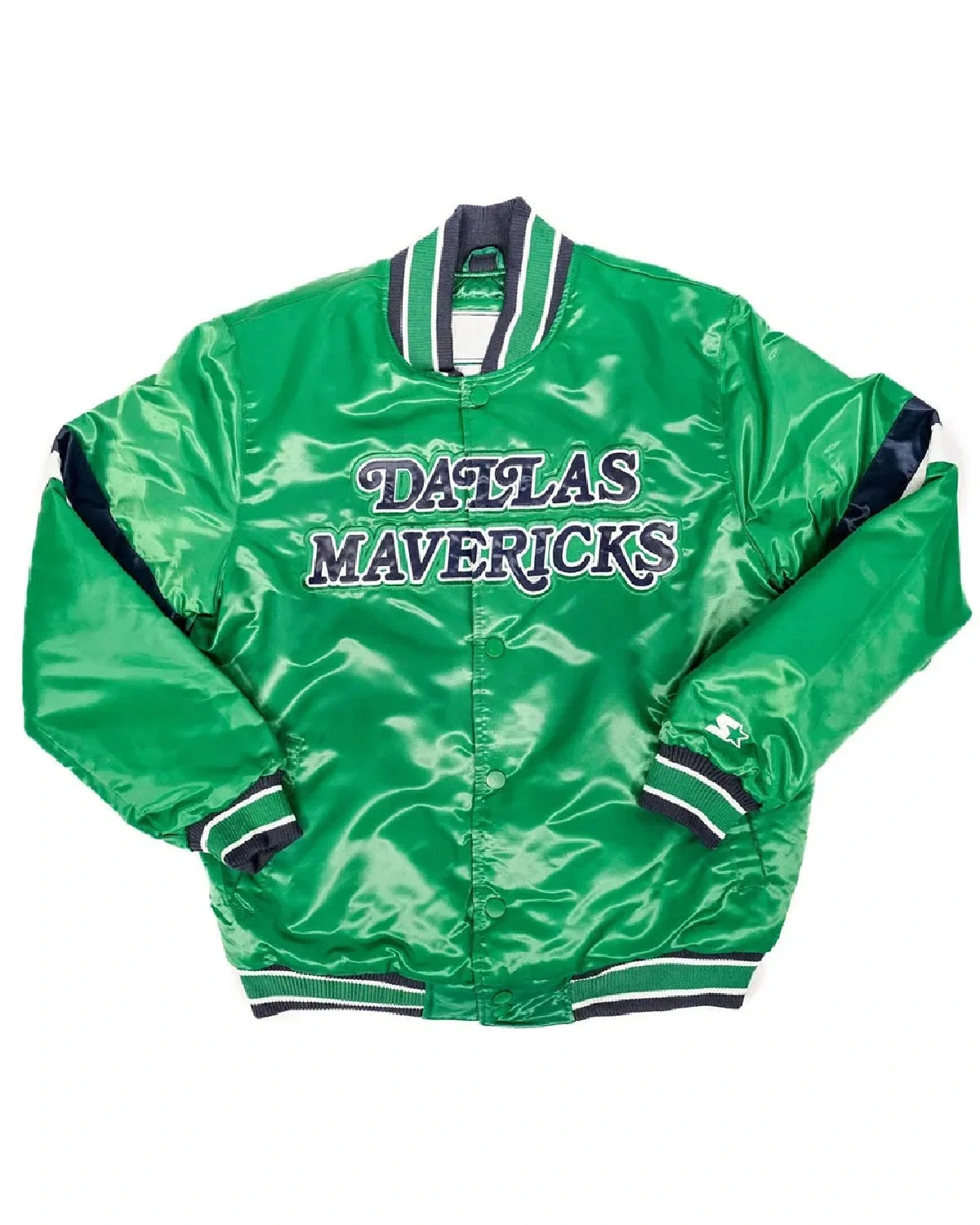 Showcase your ultimate team spirit with the official Dallas Mavericks Jacket. Crafted from premium green satin, this stunning Hardwood Classic jacket is a must-have for any true fan. It features bold, stitched lettering and the iconic team emblem, capturing an authentic on-court style. The striped rib-knit details add a timeless finish, making it perfect for game day or any casual outing.