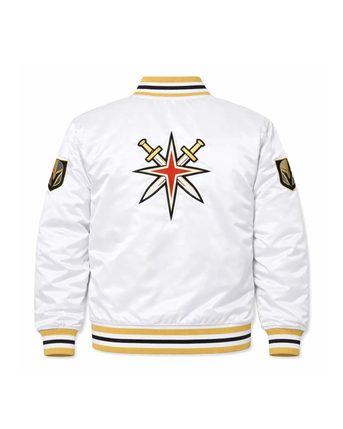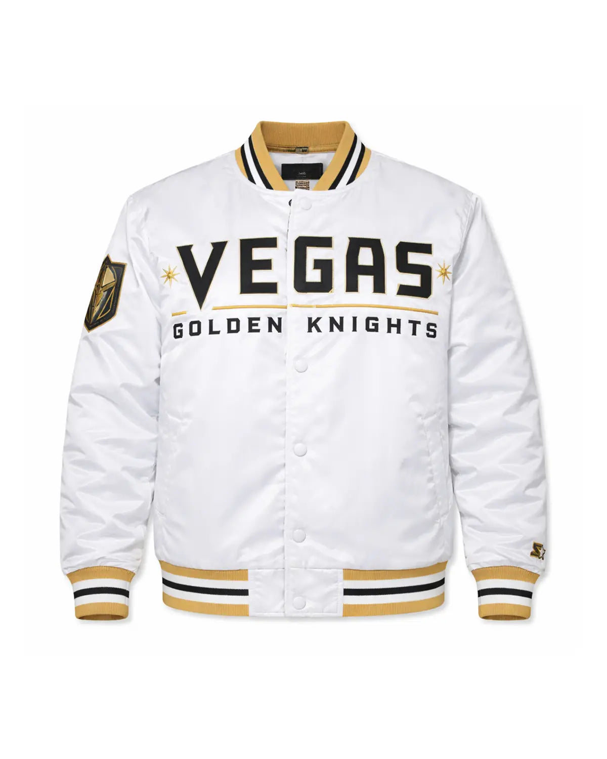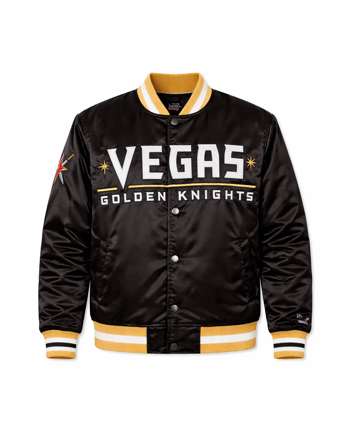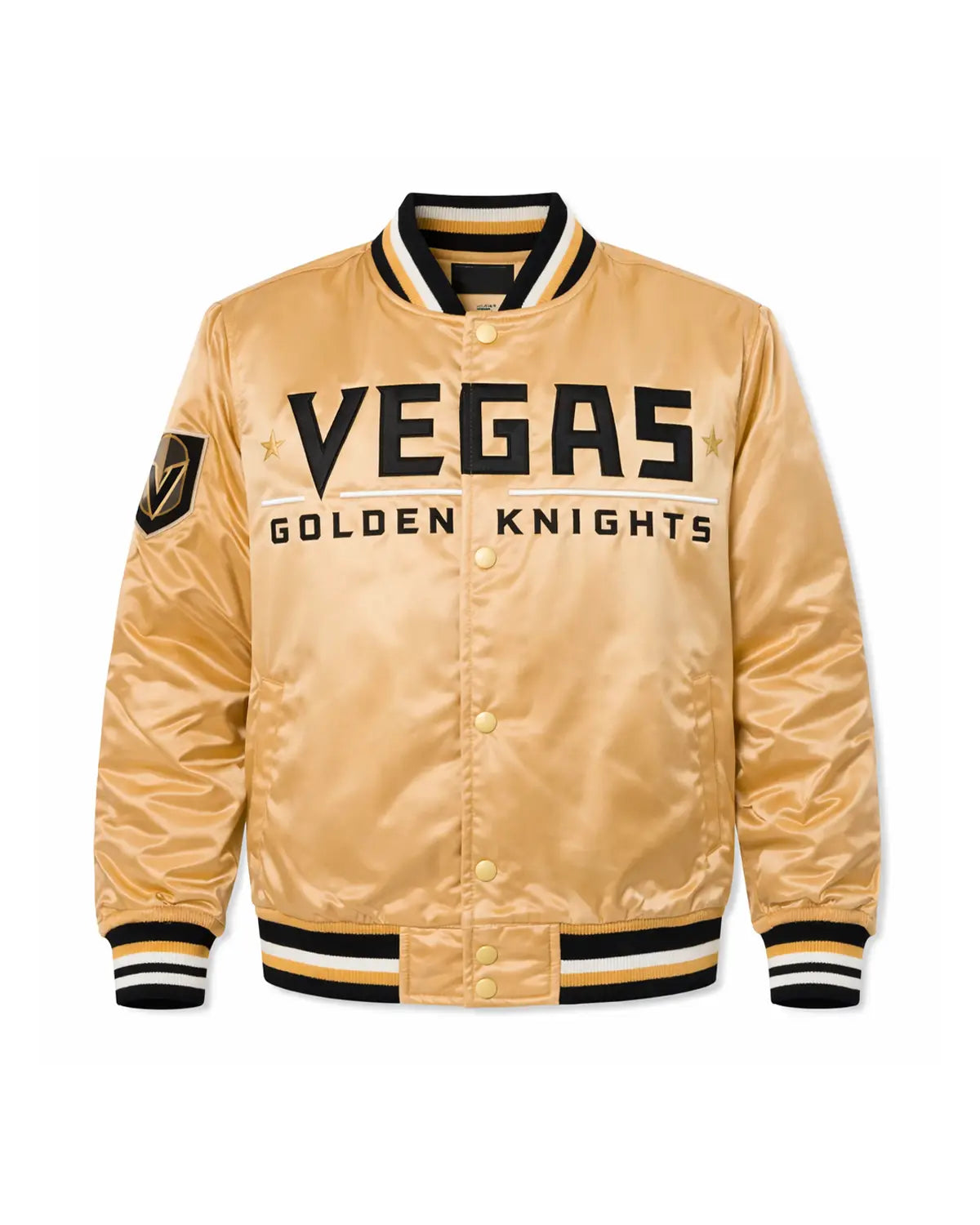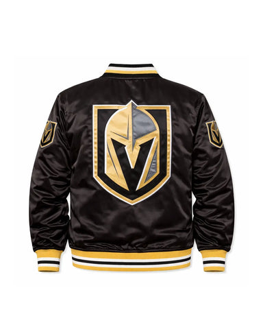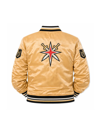 Show your unwavering support with our elite Vegas Golden Knights jacket, meticulously crafted for true fans. This exceptional satin bomber jacket boasts fine quality stitching, a luxurious satin exterior, and a comfortable viscose lining for superior wearability. It features a sleek snap-tab buttoned closure and the iconic "VEGAS GOLDEN KNIGHT" boldly displayed on the front, an undeniable statement piece.