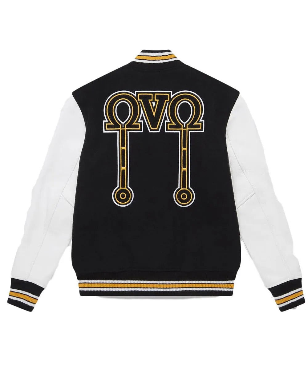 Step out in iconic style with the elite Omega OVO varsity jacket, directly inspired by October's Very Own. This premium men's wool letterman jacket is expertly crafted with a warm, black wool body and contrasting, crisp white sleeves made from 100% genuine leather. The classic snap-tab closure and fine quality stitching ensure a timeless look and durable construction that stands out from the crowd, making it a perfect addition to your wardrobe.
