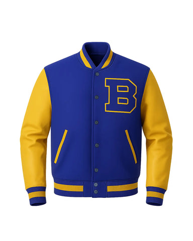 Relive the iconic style of Scott Howard with this authentic Varsity Jacket, a perfect replica of the one worn by Michael J. Fox in classic apparel. Crafted from a premium blend of genuine wool and leather, this striking blue and yellow varsity jacket features a classic rib-knit collar and cuffs. Its durable button closure ensures a timeless look that truly captures the spirit of classic clothing.