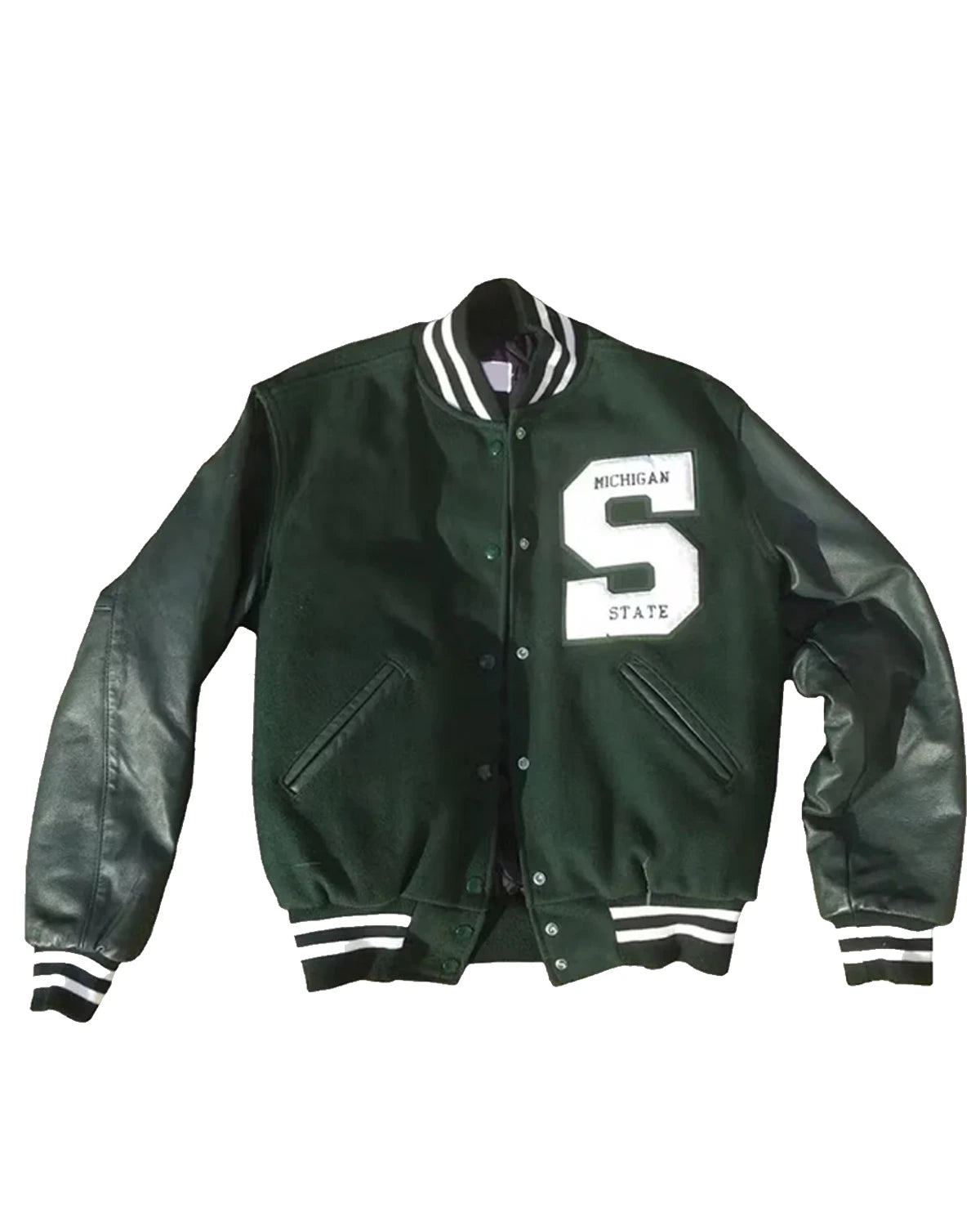 Embrace ultimate Spartan pride with the official Michigan State Aliyah Moore Varsity Jacket. Inspired directly by Aliyah Moore, this stunning green varsity jacket is expertly crafted for dedicated fans and fashion enthusiasts alike. The premium wool body combined with genuine leather sleeves offers an unmatched look, superior comfort, and long-lasting durability. It’s the perfect statement piece to represent your team spirit everywhere you go, blending classic style with modern athletic heritage.