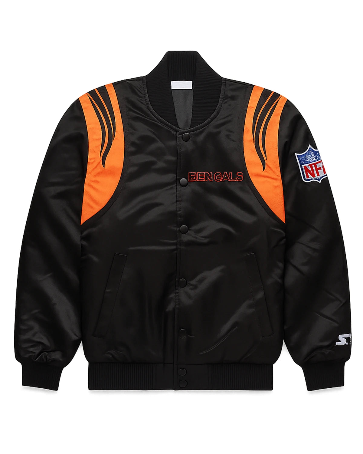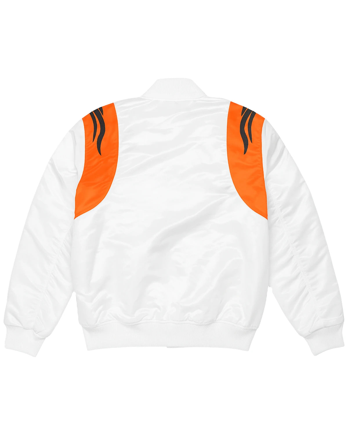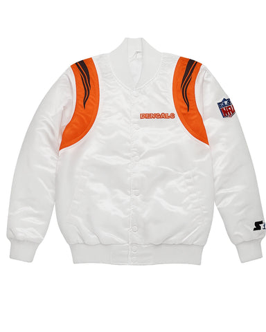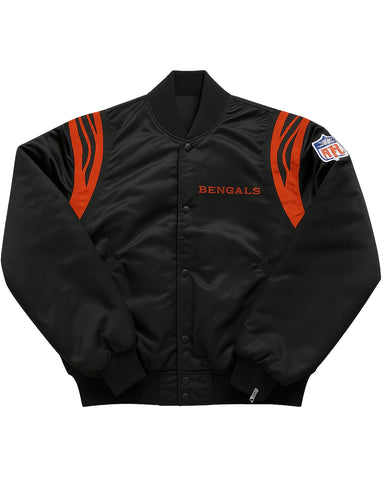 Elevate your game-day look with this elite NFL Bengals jacket, the ultimate piece of Bengals fan gear for any true supporter. Crafted from luxurious satin with a striking black and white design, it showcases your loyalty with finely stitched logos on the chest and sleeve. This jacket is the perfect way to represent your team, combining classic style with unwavering pride, making it a standout piece of Cincinnati Bengals Bomber jacket for any occasion.