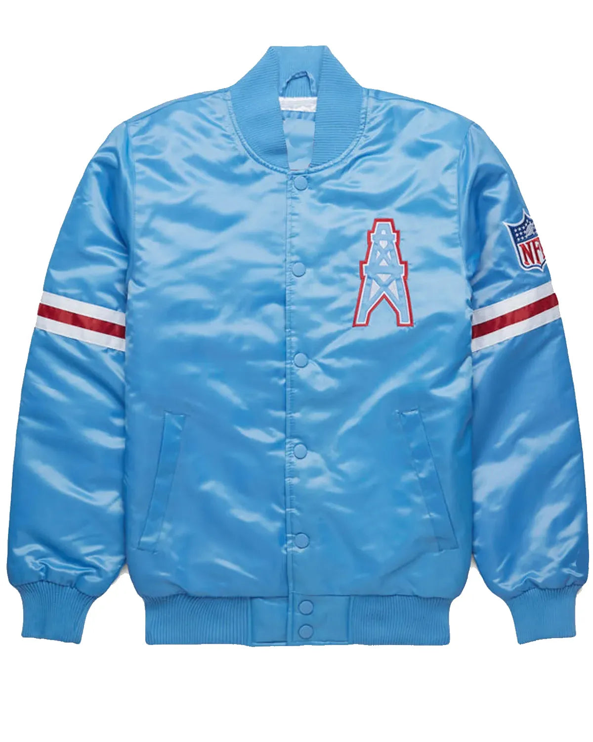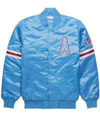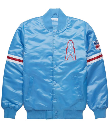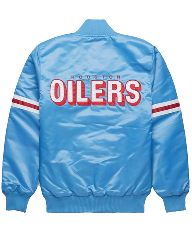 Step out in iconic fan style with this elite NFL Houston Oilers Blue jacket. Crafted from premium light blue satin, this piece shines with retro appeal while the soft viscose lining ensures all-day comfort. The fine-quality stitching guarantees durability for seasons to come. This authentic Oilers Houston bomber jacket is the perfect way to honor your team's legacy, offering a sleek look and a comfortable fit that stands out in any crowd.