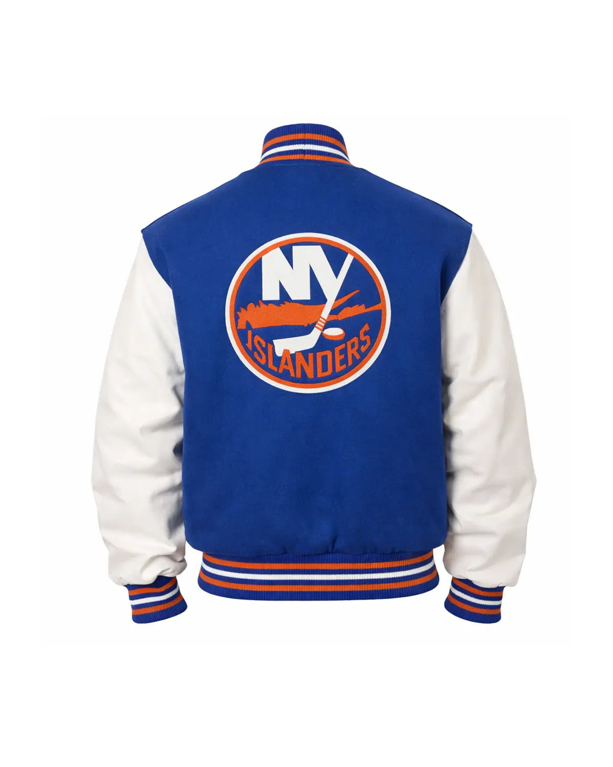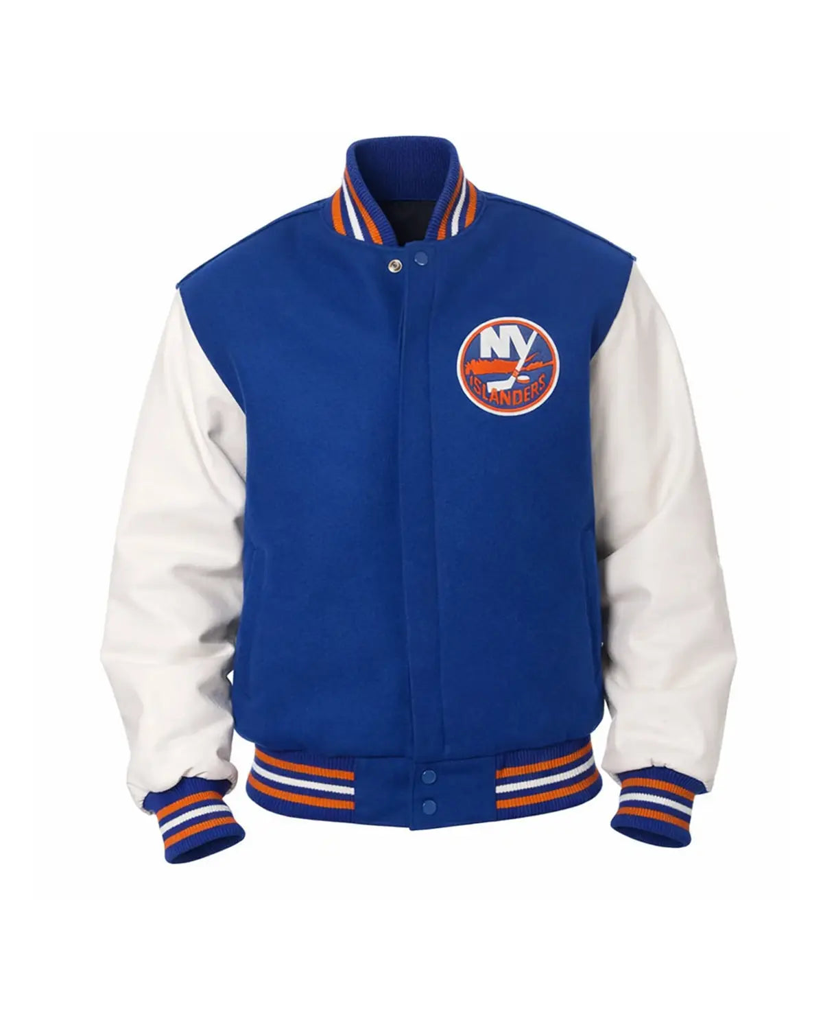 Showcasing a timeless blue and white color scheme, this New York Islanders varsity jacket offers a stylish front button closure and two practical side pockets for convenience. Designed for both men and women, it's the quintessential Islanders fan jacket to represent your team. More than just apparel, this **unisex sports jacket** makes a fantastic gift, blending classic charm with unwavering NHL pride, ensuring you stand out as a true supporter of the Islanders.