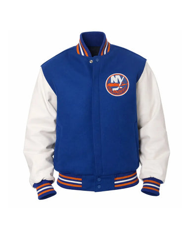Embrace ultimate team spirit with our NY Islanders Letterman Jacket, a premium blend of wool and genuine leather. This iconic design, deeply inspired by the New York Islanders, provides exceptional comfort with its soft viscose lining, making it perfect for any devoted fan. Featuring a classic rib-knitted collar, cuffs, and hemline, alongside full-length sleeves and meticulous fine quality stitching, this jacket is built for enduring style and warmth on colder days and game nights.