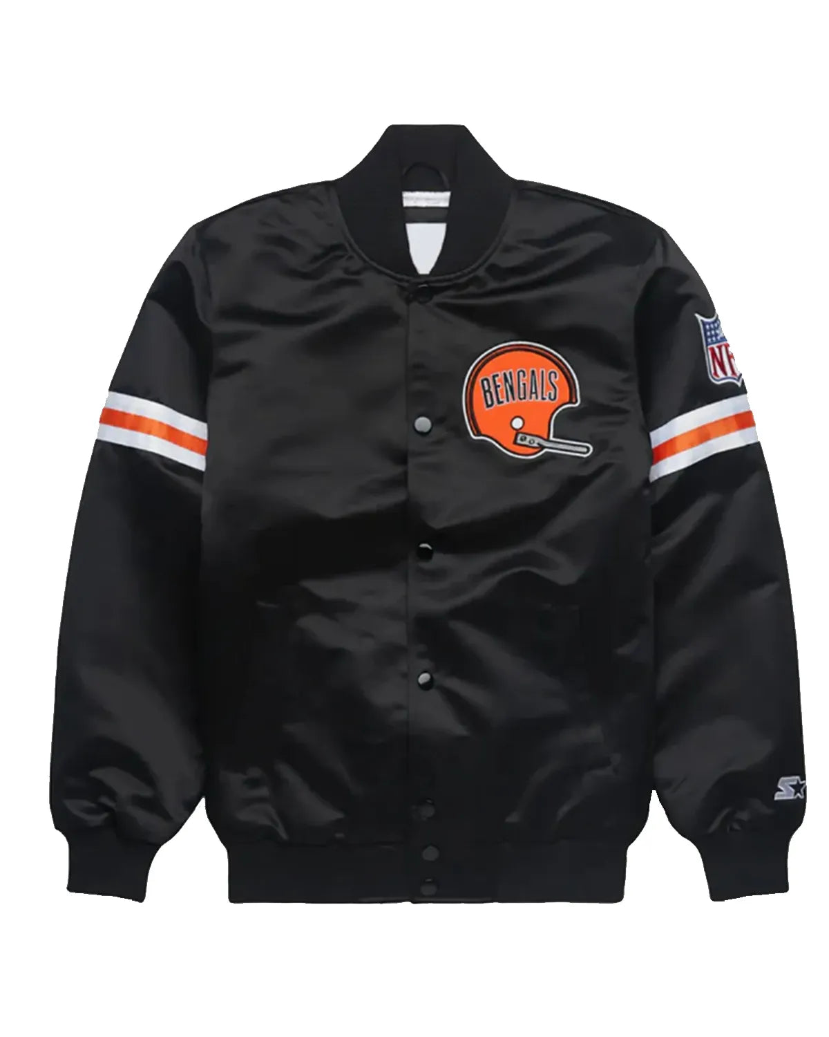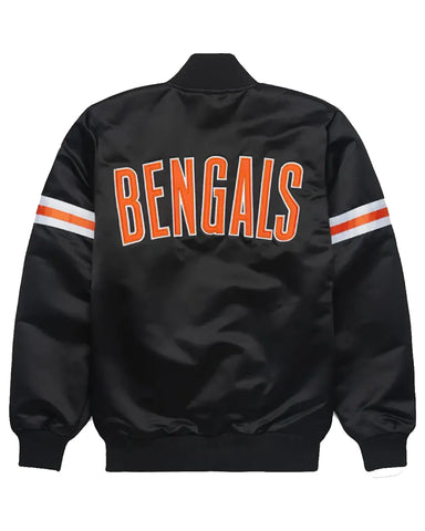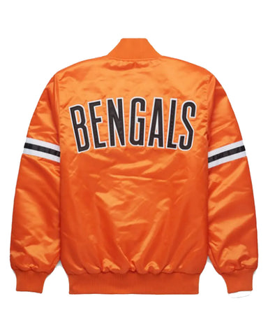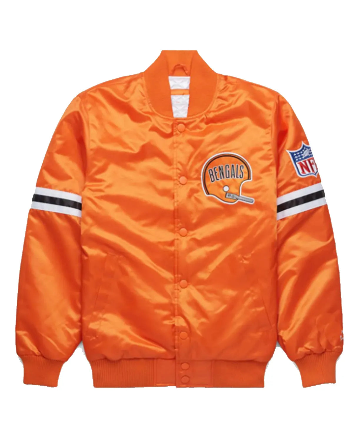 Elevate your game day look with our elite Bengals Starter Bomber Jacket. This vibrant orange Bengals jacket is crafted from premium satin with a soft viscose lining for ultimate comfort. Perfect for any die-hard fan, this piece of Cincinnati Bengals apparel combines iconic style with superior quality. The fine stitching and classic design ensure it stands out in any crowd, making it a must-have for showcasing your team loyalty all season long.