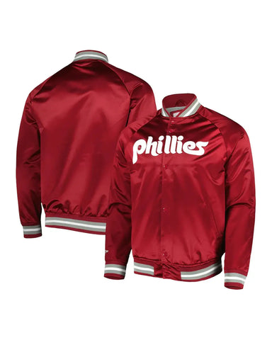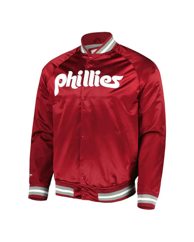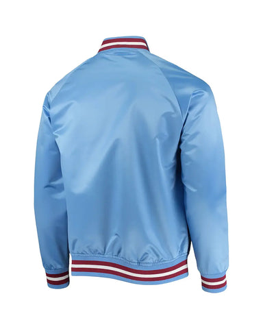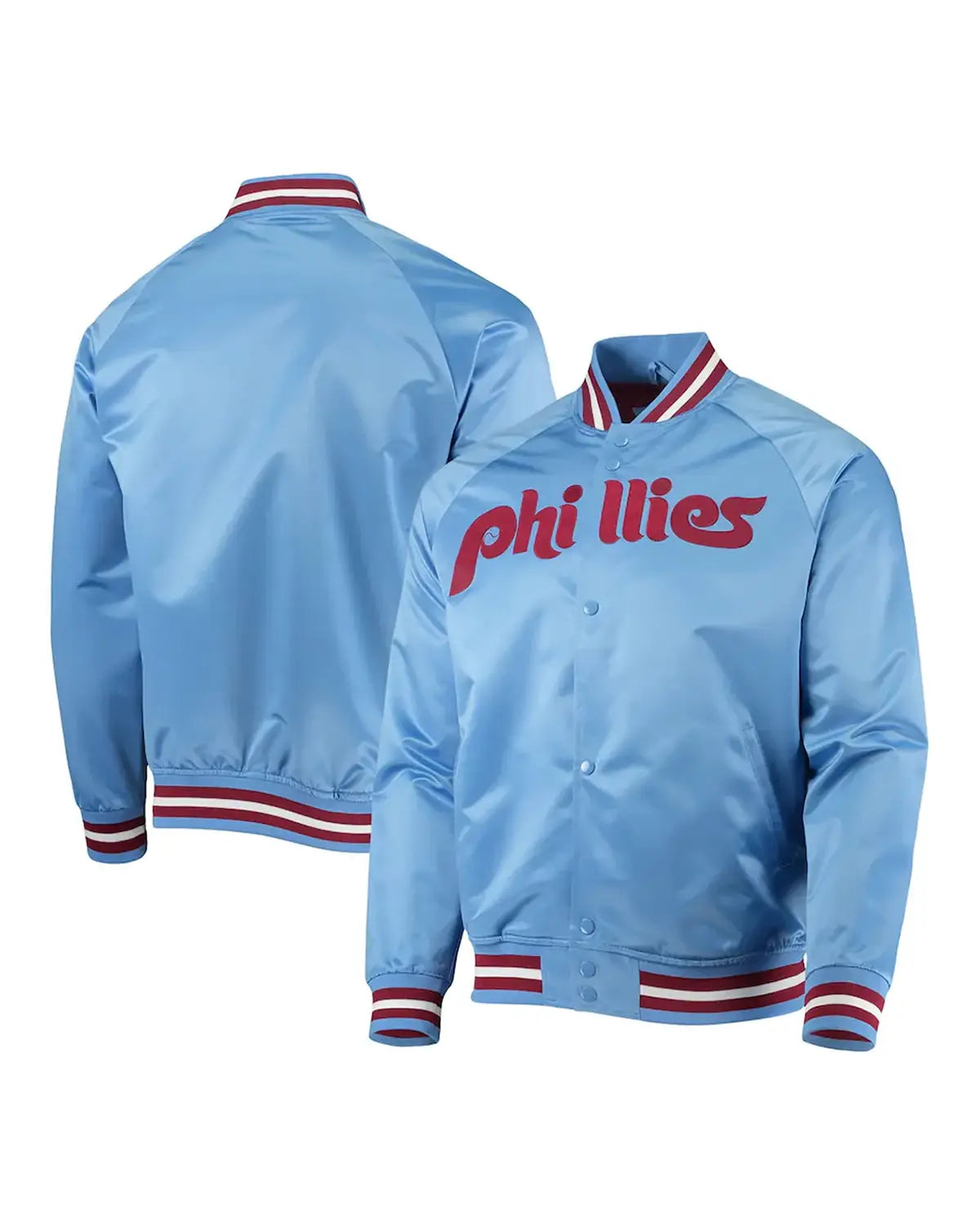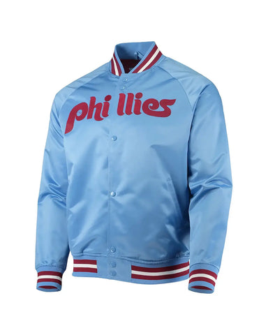 Unleash your team spirit with our premium Philadelphia Phillies satin baseball jacket, a stunning light blue homage to the iconic baseball team. Crafted from smooth, high-quality satin baseball jacket material, this design boasts fine stitching for exceptional durability and a sleek finish. It’s the perfect outerwear to showcase your unwavering loyalty, whether at the game or out with friends.
