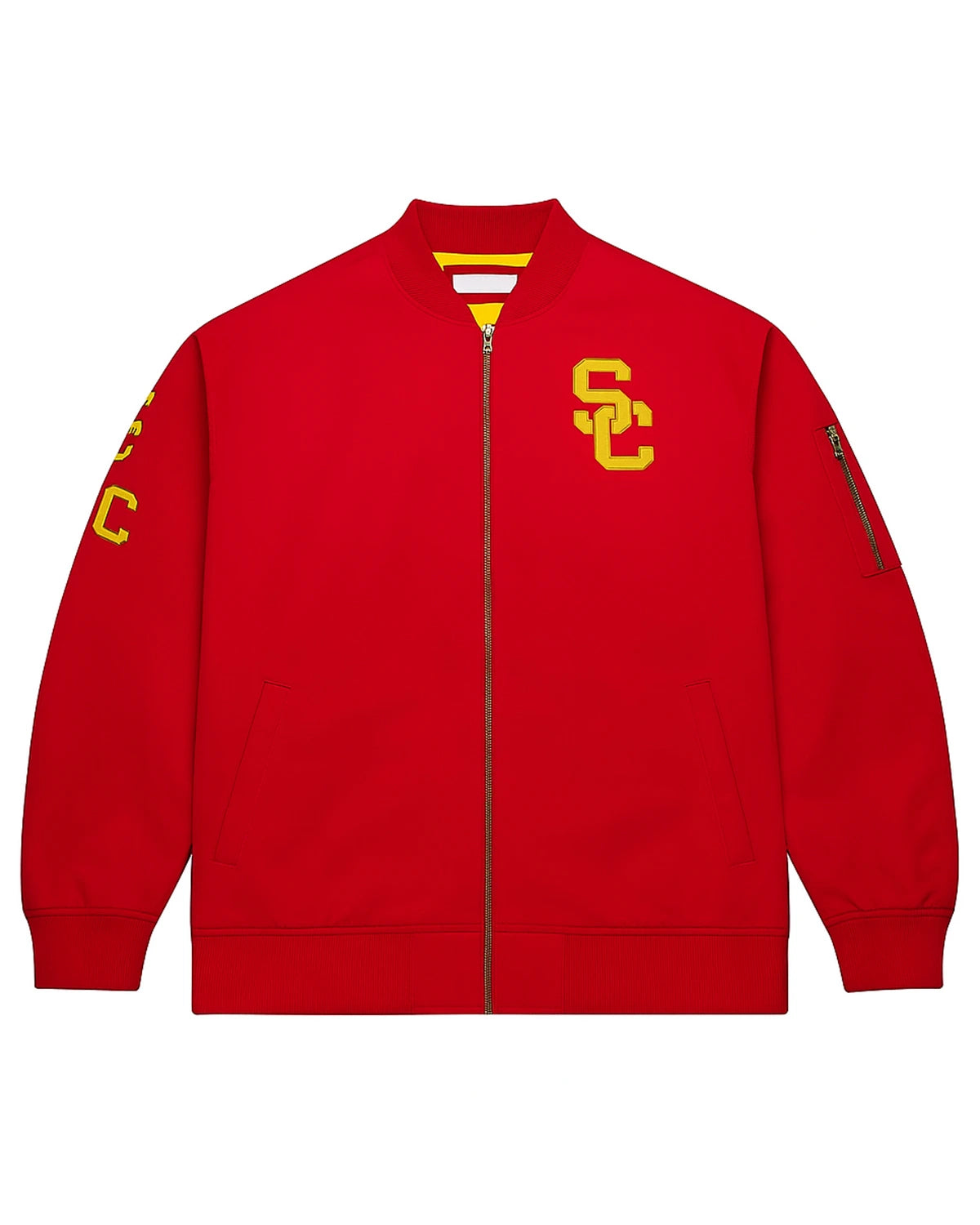 Elevate your fan game with the ultimate USC Trojans Cardinal SC bomber jacket, a true standout piece for every dedicated supporter. This striking bomber Jacket is expertly crafted from premium satin team jacket material, featuring a vibrant red inspired by your favorite football team. With superior quality stitching and a comfortable viscose lining, this unisex jacket ensures lasting durability and a perfect fit for both men and women.