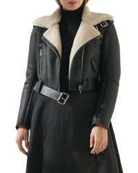 Womens Black Short Length Shearling Leather Jacket - X-Small / Black
