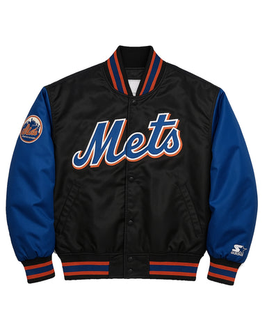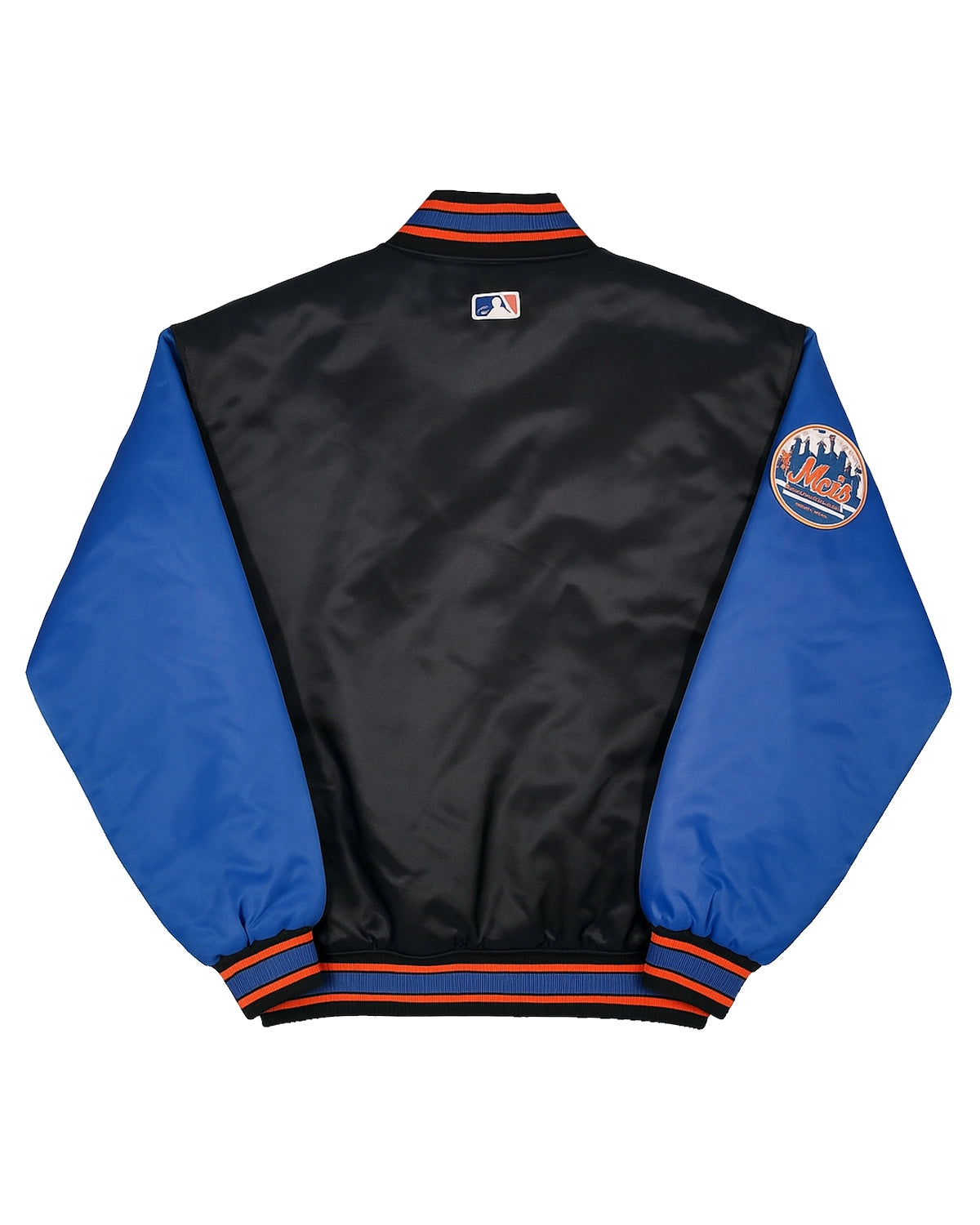 Step back in time with this iconic New York Mets Varsity jacket, a true tribute to 90s baseball fashion. Crafted from luxurious satin bomber jacket material in a striking blue and black combo, this piece features a classic ribbed stripe standup collar and a full snap tab closure. It's the perfect way to showcase your loyalty with an outsized “Mets” lettering across the front, embodying timeless vintage Mets apparel appeal.