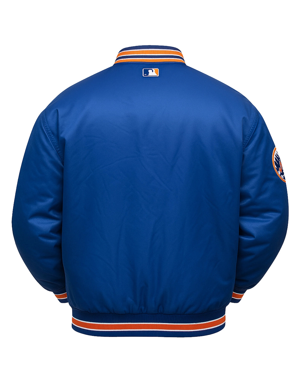 Embrace the legendary 90s style with our New York Mets Blue Jacket, a vibrant tribute to your favorite baseball team. This premium satin baseball jacket features a classic rib-woven striped peak collar and a convenient full snap button closure. Proudly displaying the iconic NY Mets embroidered logo and inscription details on the front and right sleeve, its fine quality stitching ensures lasting fandom.