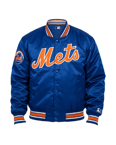 Designed for ultimate comfort, it includes a soft viscose inner lining and practical storage with two front hand pockets plus two inner pockets. The full-long sleeves, rib-woven striped cuffs, and matching waistline provide a perfect, snug fit. Complete with distinct Starter brand jacket logos at the back and left-hand wrist, this piece of vintage Mets apparel is truly official Mets gear for devoted fans.