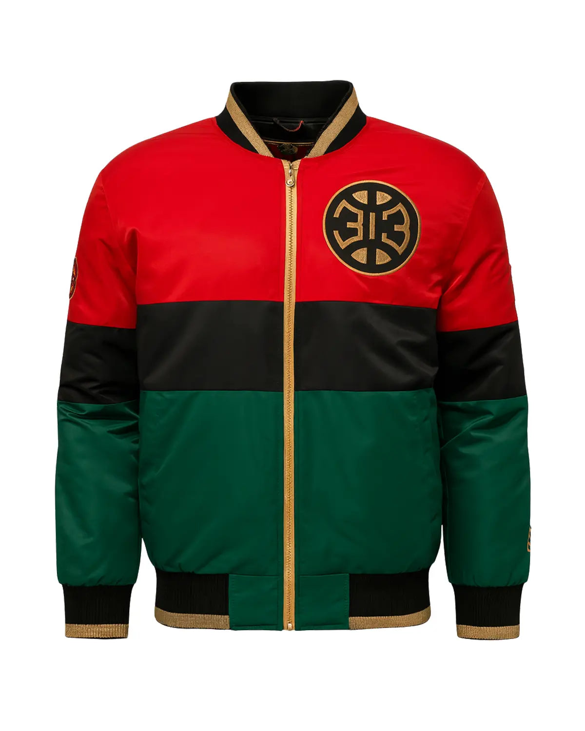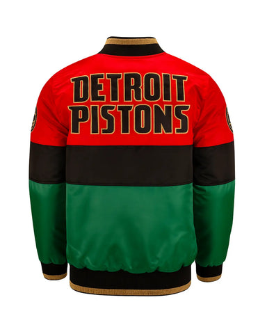 Celebrate heritage and team pride with the striking Black History Month Detroit Pistons jacket. This Black History Month apparel showcases a vibrant tri-color satin design in red, black, and green, making it a standout piece for any devoted fan. Featuring a comfortable strip-ribbed collar and matching cuffs, alongside a smooth full-zip closure, it's designed for both style and effortless wearability. The soft viscose lining ensures supreme comfort, perfect for game days or versatile everyday occasions.