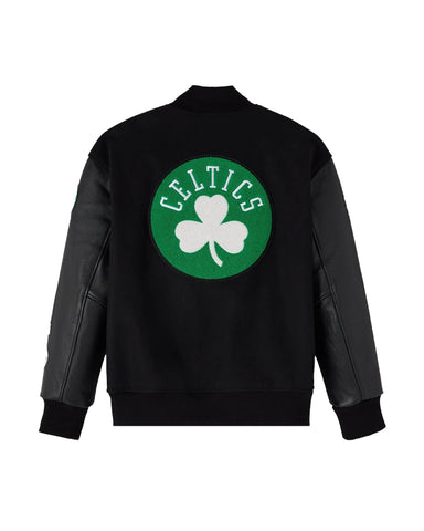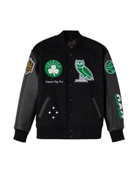 Step out in unmatched style with our Elite Boston Celtics OVO varsity jacket , a must-have for any true fan. This jacket officially inspired masterfully blends luxurious genuine leather sleeves with a premium black wool body, crafting a sleek black leather wool jacket design. It’s built for both enduring comfort and superior style, making it the perfect statement piece for showing your team pride.