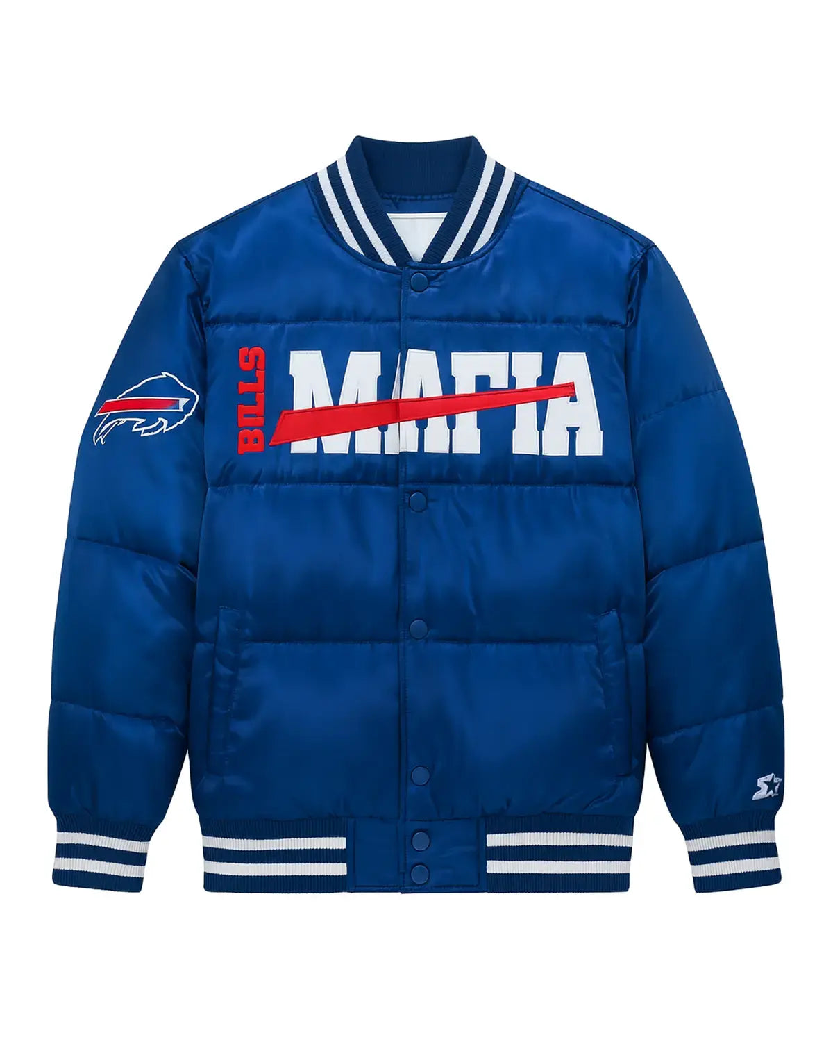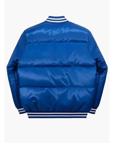 Embrace the spirit of the Bills Mafia with the ultimate Buffalo Bills Mafia Blue Puffer Jacket. Crafted from luxurious satin material in a vibrant blue, this jacket showcases your fandom with bold logos on the chest and right sleeve. Its distinctive stripe-ribbed collar and cuffs, paired with a convenient full snap tab closure, offer both iconic style and effortless wear.