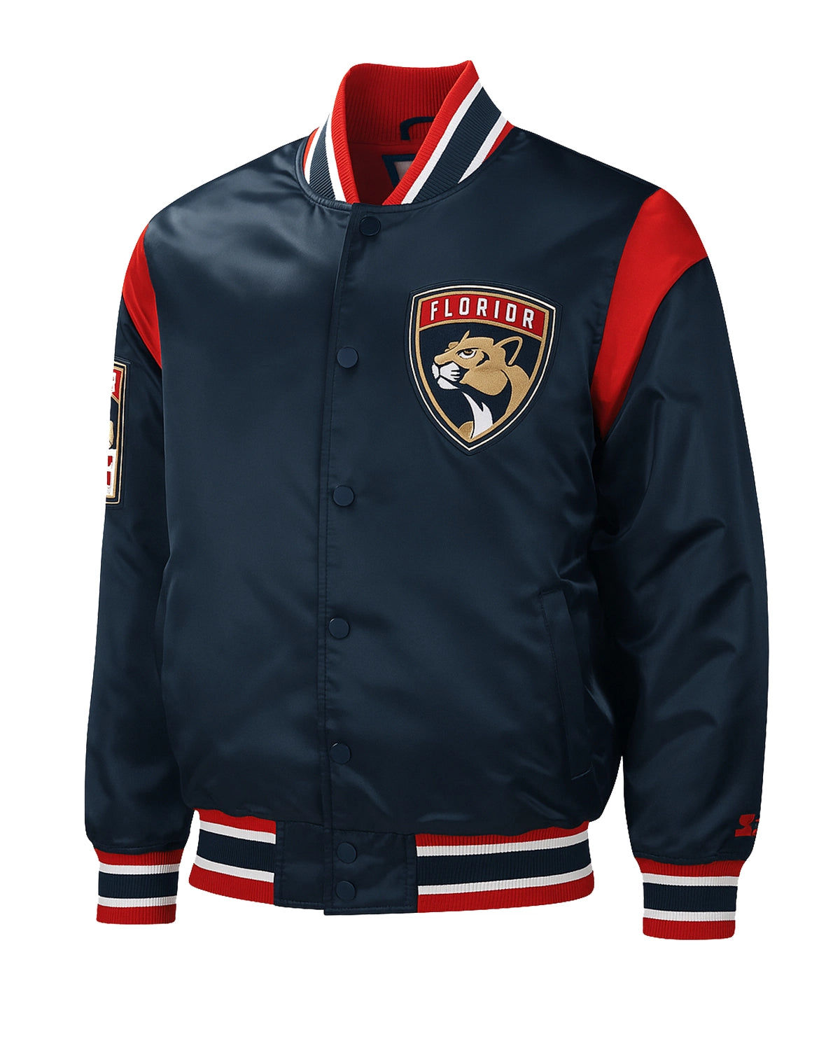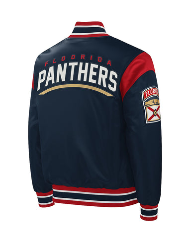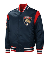 Show your unwavering team spirit with the Florida Panthers Force Play Jacket, a must-have for every dedicated fan. Crafted from luxurious navy blue satin jacket, this outerwear boasts authentic team logos prominently displayed on both the front and sleeve, making it instantly recognizable. The smooth, premium satin exterior combined with a soft, comfortable viscose inner lining ensures an exceptional feel and warmth.