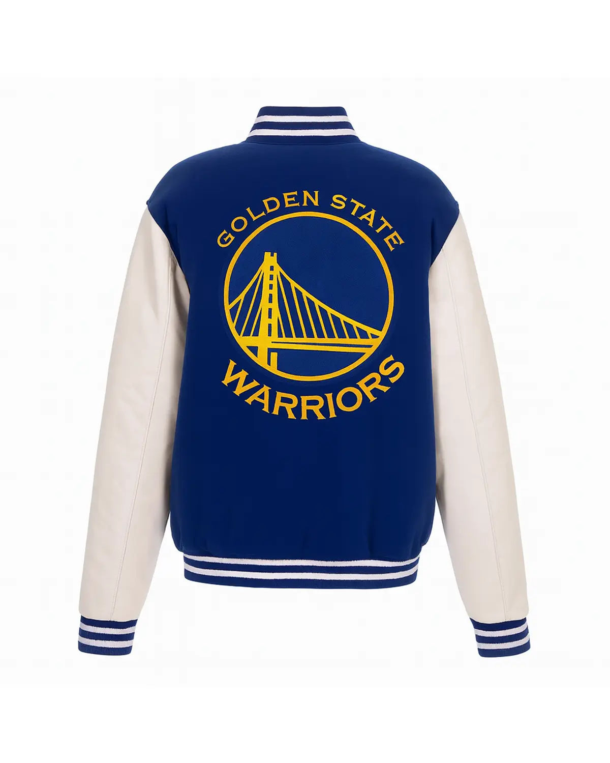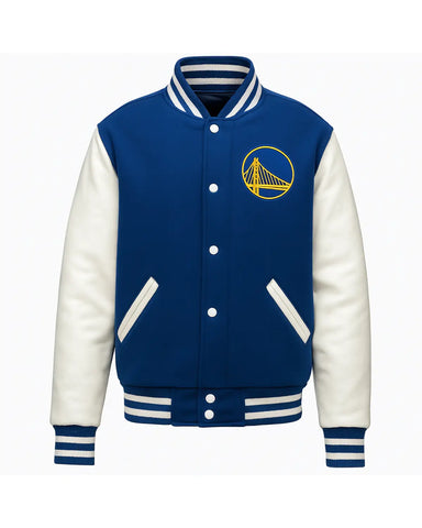Show your team pride with the official Golden State Warriors varsity jacket, a must-have for any true fan. This men's royal blue varsity jacket features a durable wool body complemented by authentic genuine leather sleeves for a classic, sophisticated look. The vibrant royal blue and white design, complete with a distinctive team logo on the left chest, makes a bold statement.