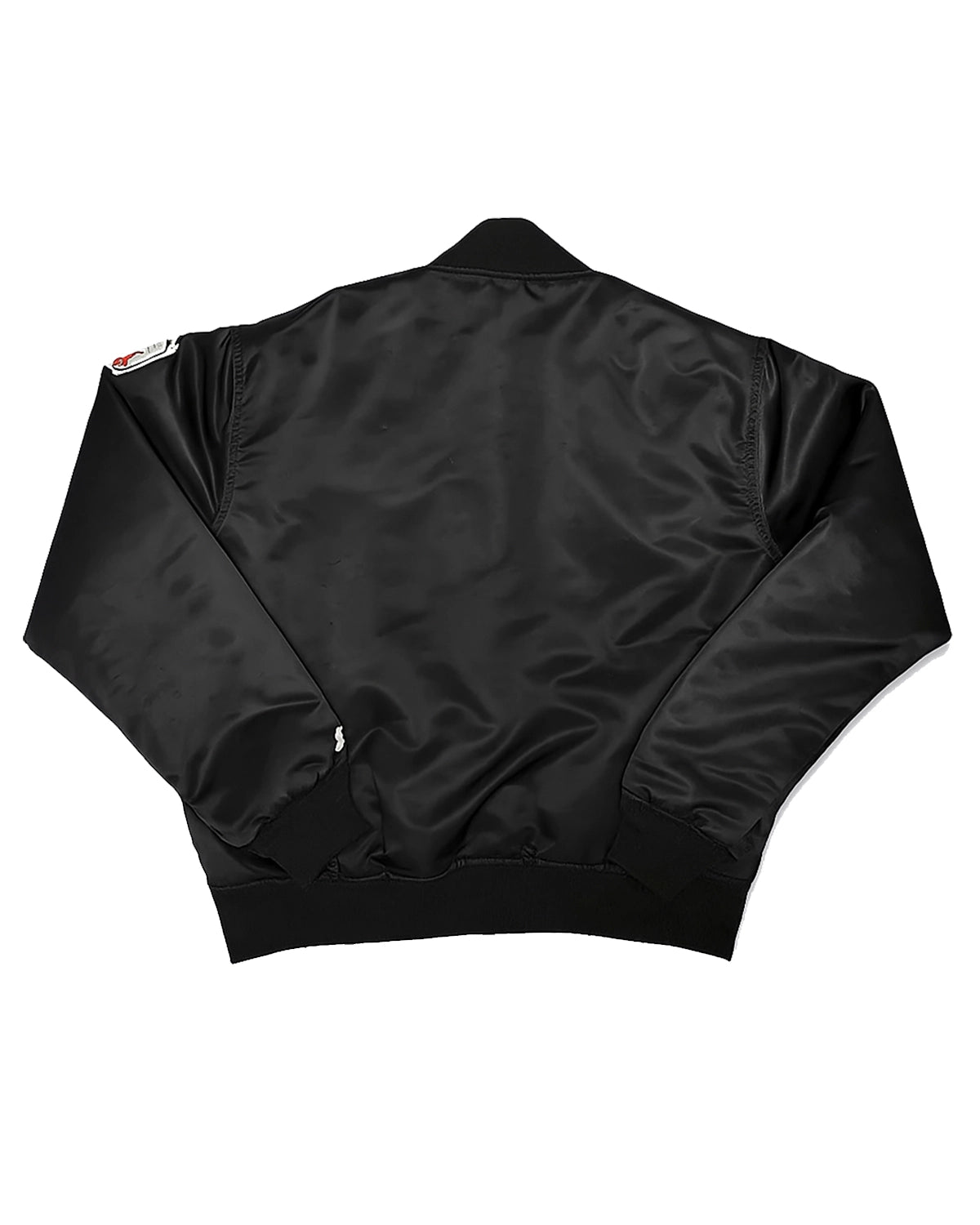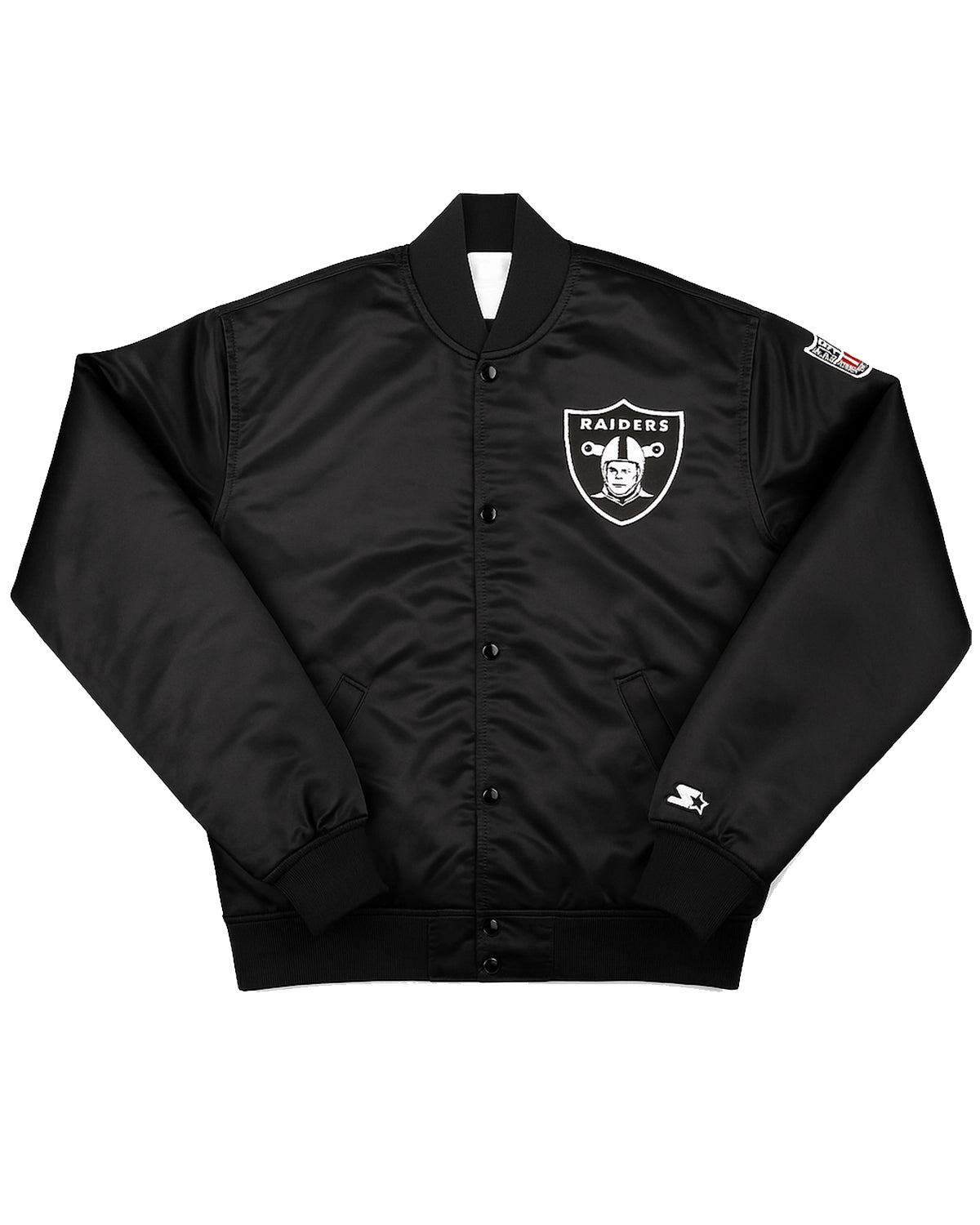 Featuring a classic rib-knitted collar, cuffs, and hemline, this Las Vegas Raiders bomber jacket ensures a snug, stylish fit. The front snap tab closure adds a touch of authentic retro charm. Complete with the distinctive Raiders logo on the chest and practical dual pockets, it's the ultimate black Raiders jacket for any devoted fan.