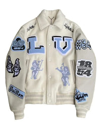 Experience timeless style with our premium Louis Vuitton cream varsity jacket. Expertly crafted with a warm wool body and genuine leather sleeves, this piece offers superior comfort and a classic look. The soft inner lining and full snap closure make this wool and leather jacket a must-have for any season, blending collegiate heritage with modern street fashion and effortless cool.