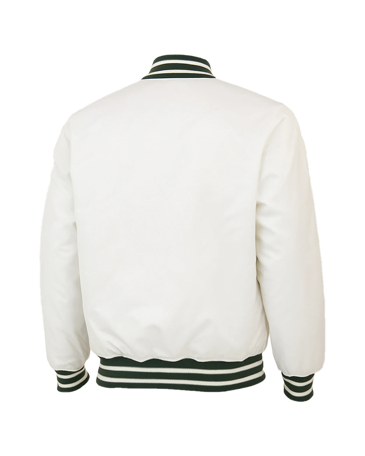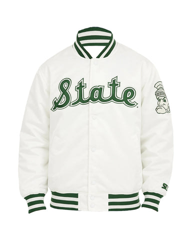 Inspired by the legendary "Michigan State Spartans" football team, this meticulously designed Michigan State white satin jacket proudly displays a tailored fabric applique "State" inscription on the front, vibrant team logo graphics on the sleeves, and distinctive branded embroidery at the wrist. Boasting fine quality stitching and a sleek rib-woven striped collar and waistline, this exceptional Michigan State apparel offers unparalleled team spirit and timeless athletic appeal.