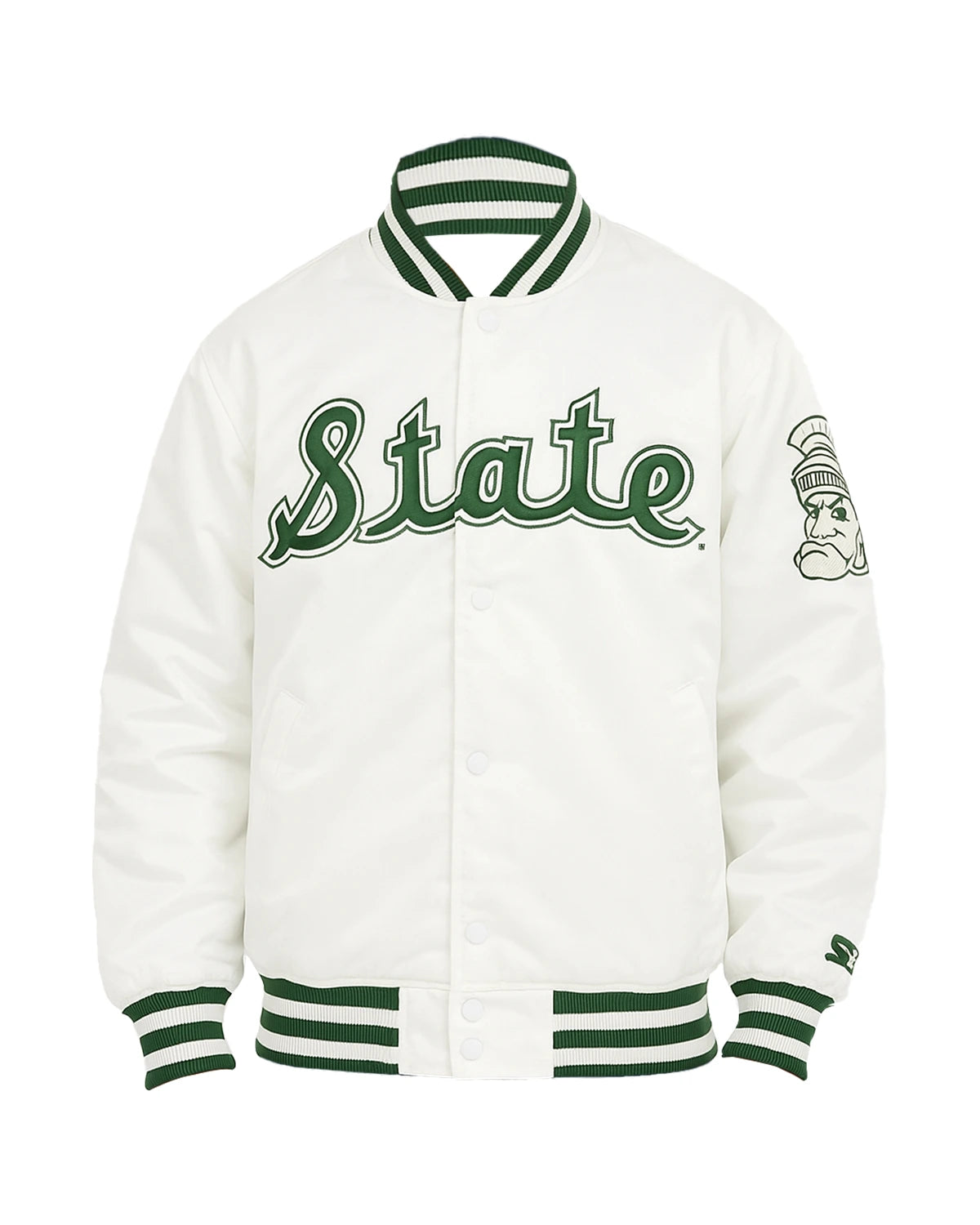 Elevate your game-day style with the stunning Michigan State Spartans varsity jacket. Crafted from luxurious white satin jacket material, this premium piece features a soft inner viscose lining, full snap buttons, and practical dual external and internal pockets. It's the ultimate Spartans fan gear designed for both comfort and a bold statement, perfect for showcasing your unwavering allegiance to your team.