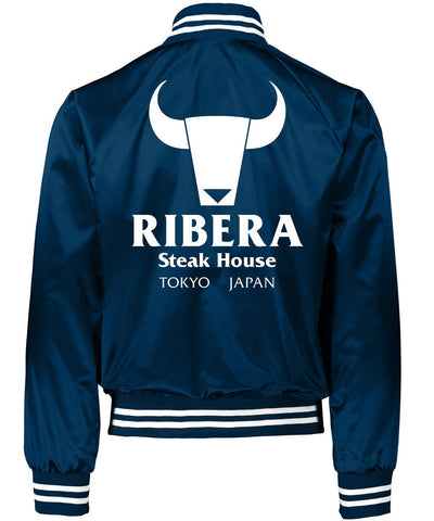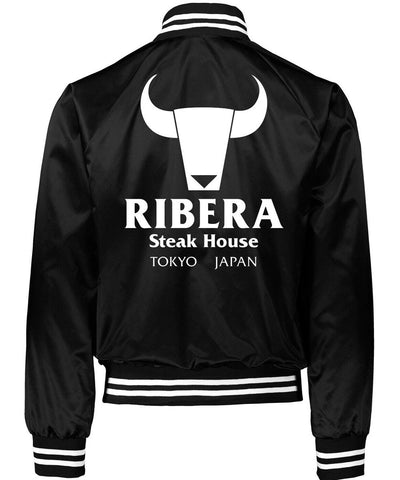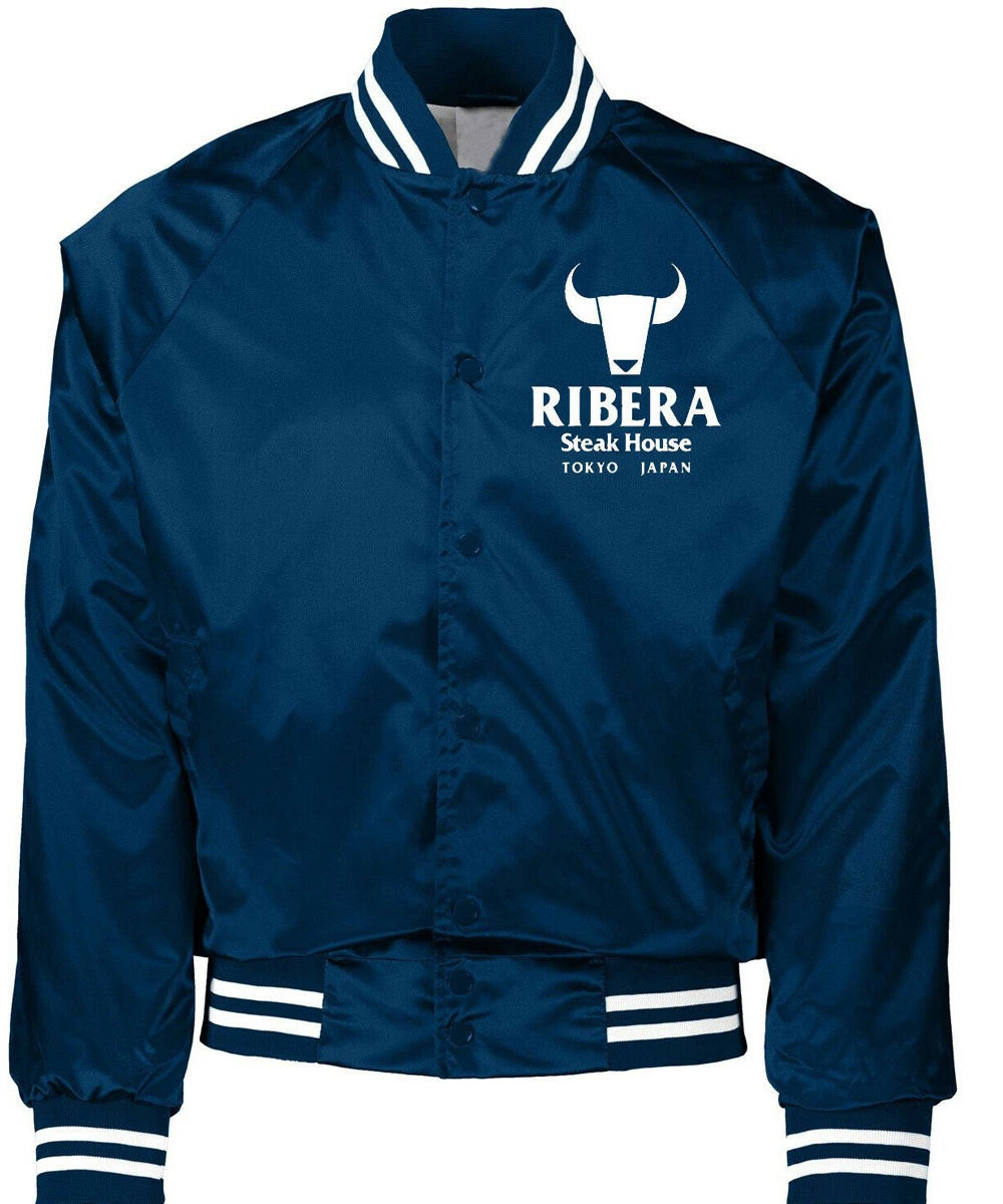 Designed for style and comfort, this versatile satin Ribera Steakhouse bomber jacket is perfect for any occasion. The rib-knitted collar, cuffs, and hemline provide a snug, classic fit while the buttoned front adds retro charm. Available in vibrant red, cool blue, or classic black, it’s the ultimate piece of Japanese streetwear jacket. Whether you appreciate unique fashion or are a fan of the legend, this vintage steakhouse jacket is a timeless addition to your collection.