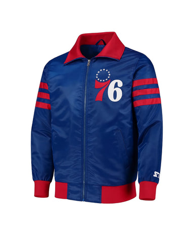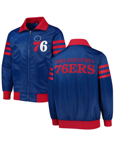 Enjoy superior comfort thanks to the soft viscose lining, making it ideal for game days or everyday style. Functionality meets fandom with two practical front slip pockets and an additional two inside pockets, perfect for securing your essentials. Full-length sleeves with rib-woven cuffs and signature sewn-on stripes complete this authentic royal blue 76ers jacket, proudly featuring NBA fan gear logos on the chest, wrist, and back. This is the ultimate Philadelphia 76ers jacket for devoted fans.