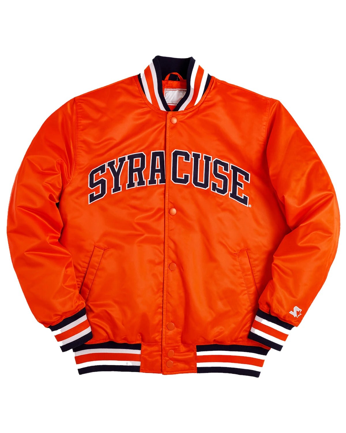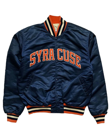 Embrace classic collegiate style with our elite Syracuse Satin Bomber Jacket. Crafted from luxurious navy blue satin, this satin bomber jacket stands out with vibrant orange and white details. The soft quilted inner lining provides exceptional warmth, making it perfect for chilly game nights. The rib-knit standup collar and fine quality stitching showcase superior craftsmanship. This isn't just a jacket; it's a statement of pride for the ultimate fan.