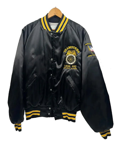 This black Teamster satin bomber jacket masterfully combines vintage appeal with practical features. The classic striped rib-knit collar and cuffs provide a snug fit, while the easy snap-button front makes it a versatile lightweight snap jacket. With multiple pockets for your essentials, this men's vintage jacket is perfect for any season, offering the ideal blend of function and sophisticated, old-school cool for your daily adventures.