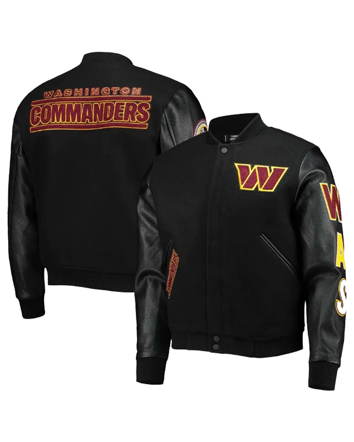 Show your unwavering team pride with the elite Washington Commanders Black Letterman Jacket. This classic Commanders varsity jacket is the ultimate piece of fan apparel, featuring bold, high-quality team logos on the chest, sleeve, and back. Meticulously designed for the dedicated supporter, it effortlessly combines timeless collegiate style with modern fan spirit, making it a standout addition to any wardrobe for game day or everyday wear.