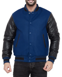 Get ready to unleash your inner trendsetter with the Men's Blue and Black Varsity Jacket. The captivating blue and black color combination exudes confidence and individuality. This jacket is a perfect blend of edgy and classic style, making it a must-have for fashion-forward individuals. The front button closure and rib-knit cuffs add a touch of retro flair. With its comfortable fit and convenient pockets, it's both stylish and practical. Elevate your wardrobe with this statement piece that will set you apart from the crowd. Get ready to make waves with your fashion choices!